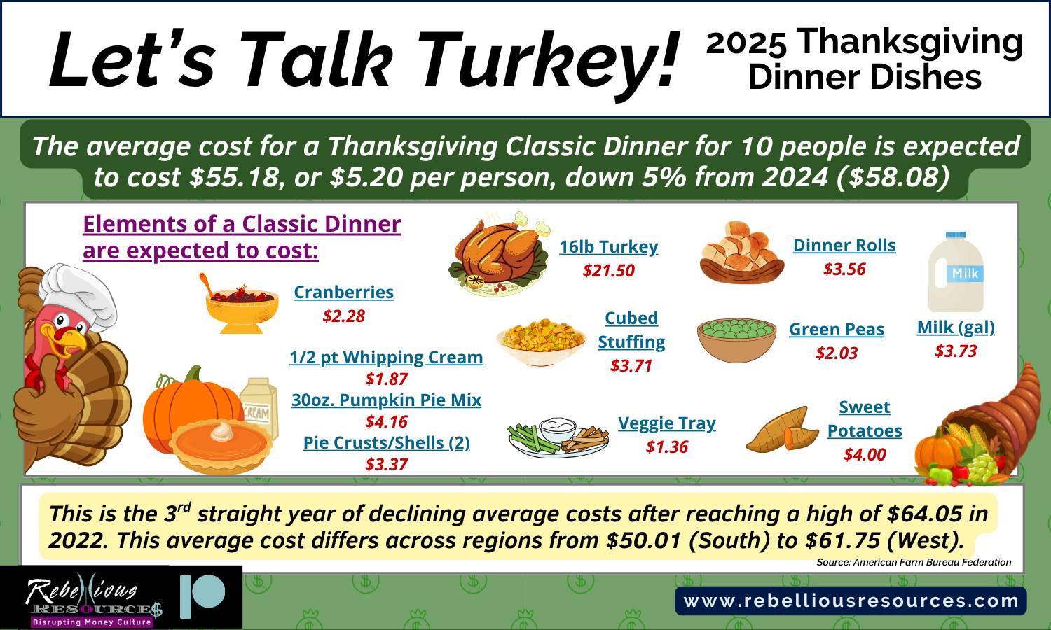 So, what did these shoppers find? Despite an almost universal struggle with rising grocery prices, the nationwide average cost for the Classic Thanksgiving Dinner for 10 was found to decline by 5% to $55.18, or $5.52 per person. This is the third straight year of declines after reaching a record high of $64.05 in 2022. In 2023, the average cost was $61.17, and $58.08 in 2024.