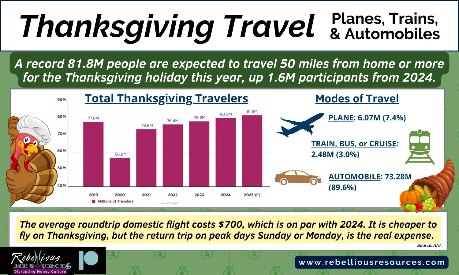 Finally, Thanksgiving is the busiest travel day of the year. AAA estimates that a record 81.8 million people will travel 50 miles or more to partake in the turkey celebrations, up 1.6 million people from 2024. How are they getting there?