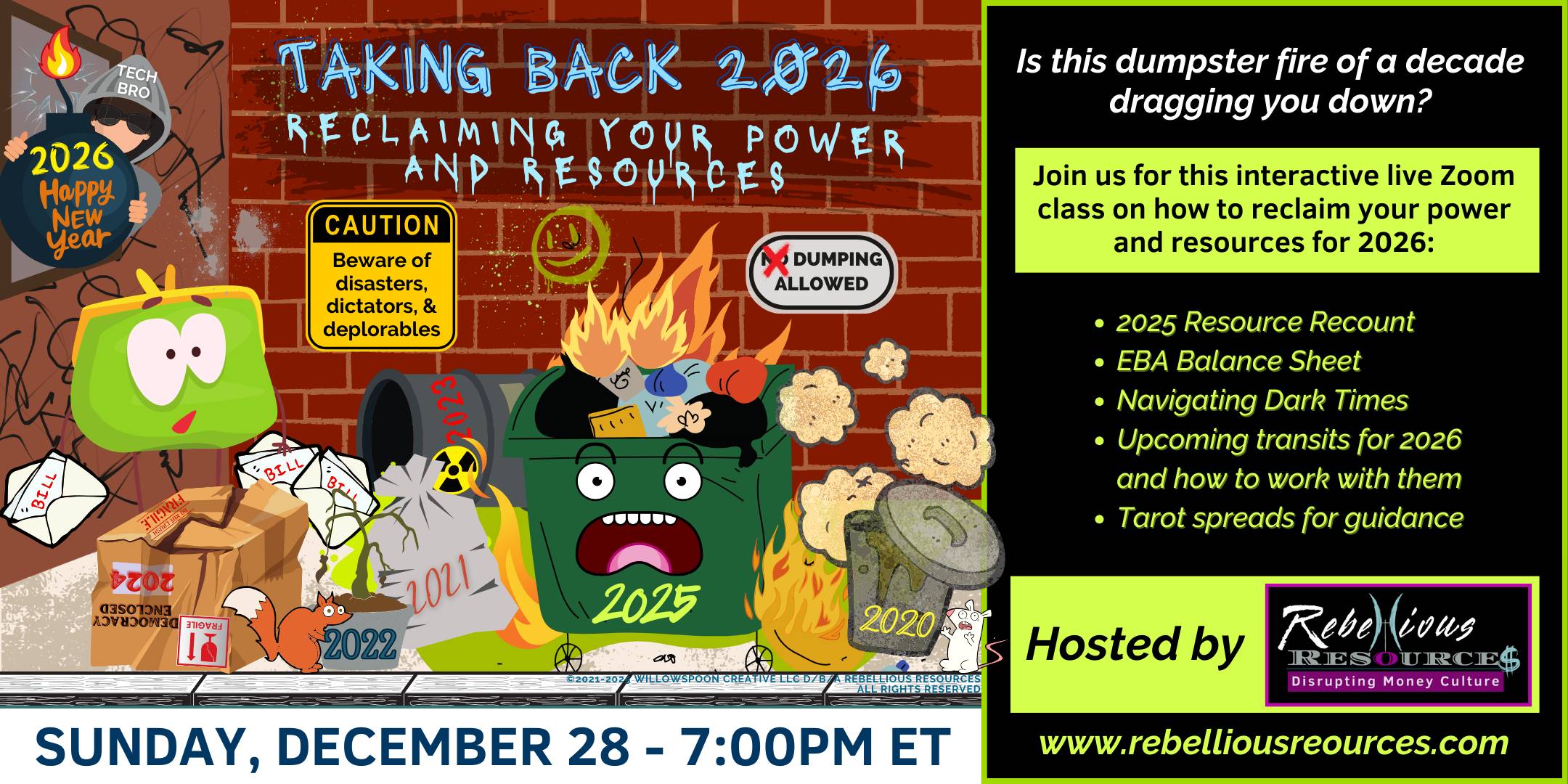 Join Rebellious Resources for Taking Back 2026: Reclaiming Your Power and Resources. In this live virtual workshop, we take you step-by-step through assessing where your resources stand, where they need additional support, and how you can work with the energies of change instead of being overwhelmed by them.